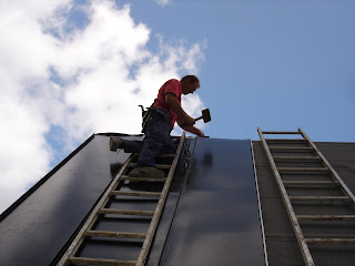 Peter måttar taket för att knäcka plåten som skall på. Huset är 18,5 meter långt, och 5,60m brett.