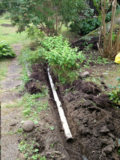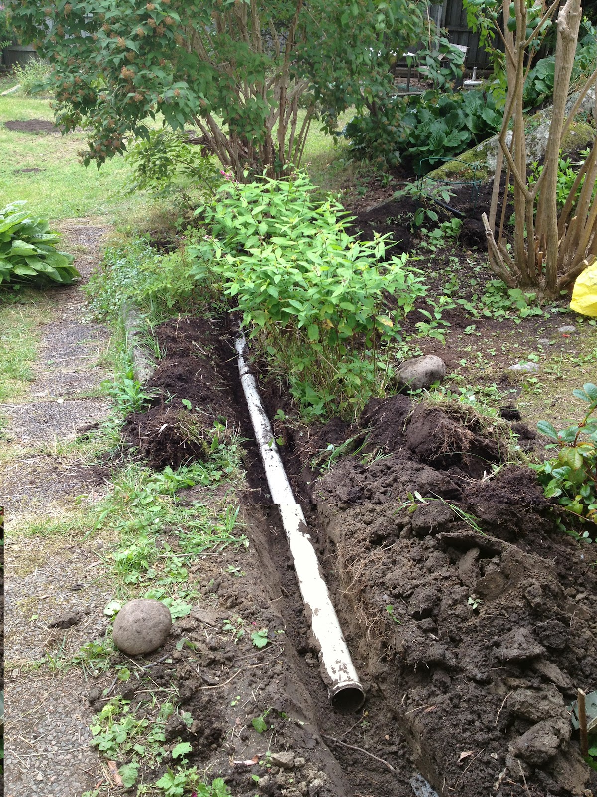 Några spadtag senare hittade jag ett vitt, gammalt sjuttiofemrör som låg som markrör, men inte var inkopplat. Det hade åkt in jord i änden, och efter en snabb signal till en stressad Peter bestämde jag mig för att avlägsna eländet.